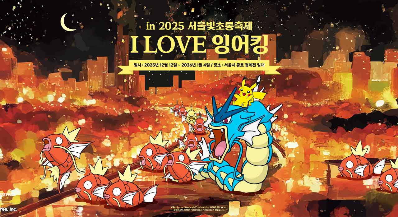 12월, 청계천에 100마리 잉어킹이 뜨는 특별한 밤은 서울 빛초롱축제의 대표적인 즐길거리입니다. 겨울 도심의 매력을 느끼며 산책하고, 포켓몬 이벤트에 참여하고, 한지 등불의 감성을 만끽할 수 있는 ‘I LOVE 잉어킹’ 전시에서 가족과 친구와 함께 소중한 추억을 만들어보세요. 이 특별한 순간을 놓치지 마시고, 사랑하는 사람들과 함께 서울의 겨울밤을 더욱 환하게 밝혀보세요!